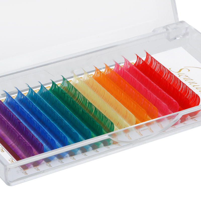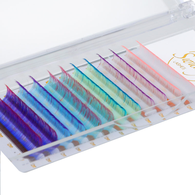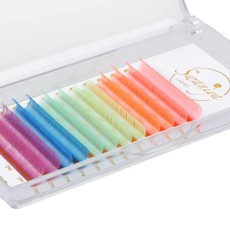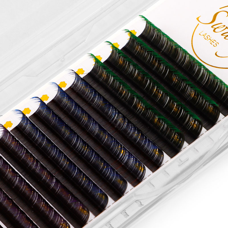 Swaniya rəngarəng kirpik uzantıları ombre rəng (ombre mavi, ombre bənövşəyi, ağ çəhrayı ombre və s.), Normal rəng (qırmızı, çəhrayı, sarı, ağ, yaşıl, mavi, bənövşəyi, bənövşəyi və s.), Neon rəngi.